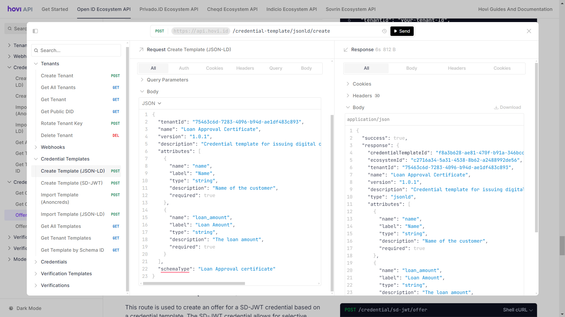 - To create a credential template navigate to POST- Create Template (JSON-LD) endpoint and click “Test Request”.