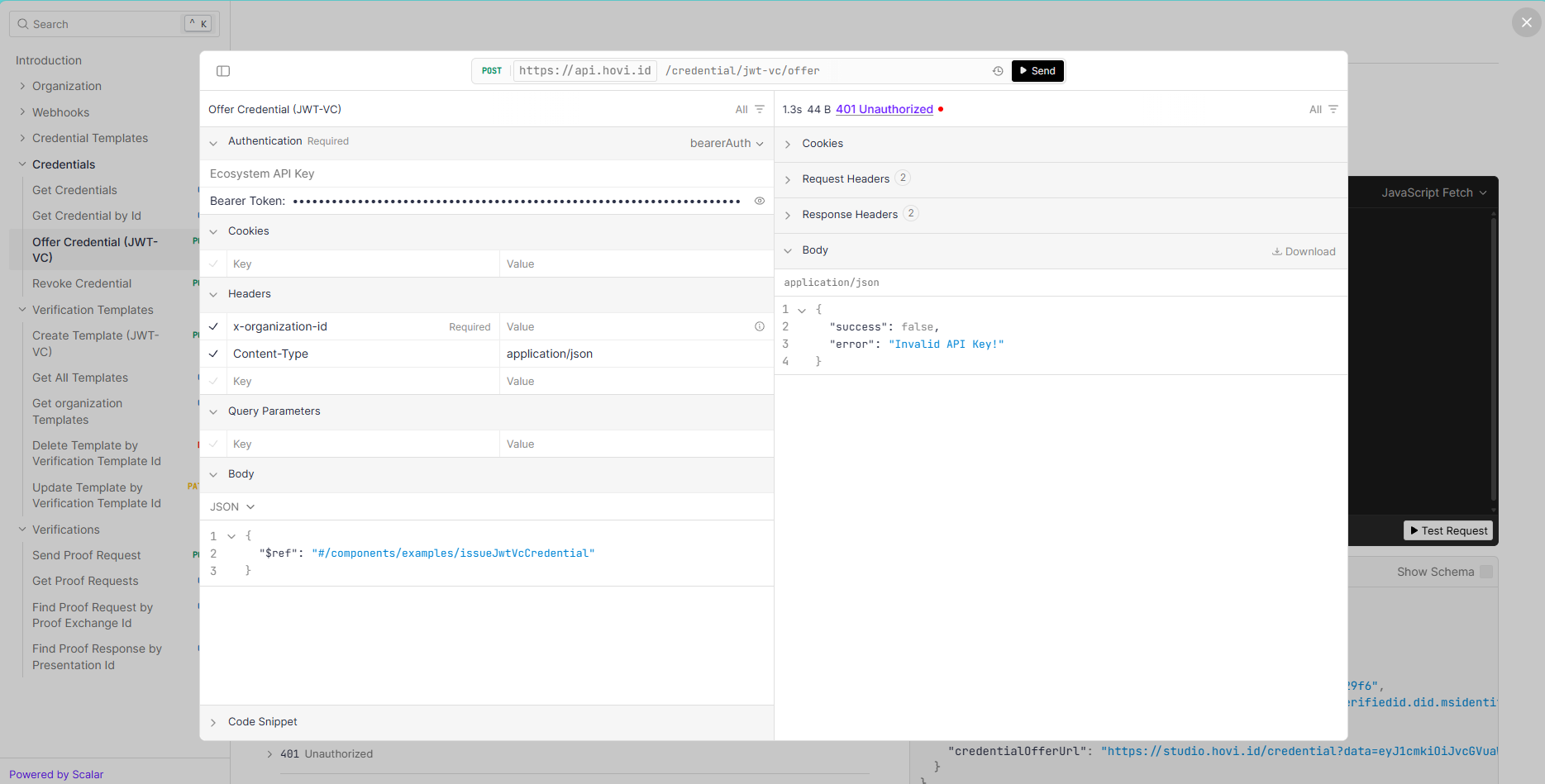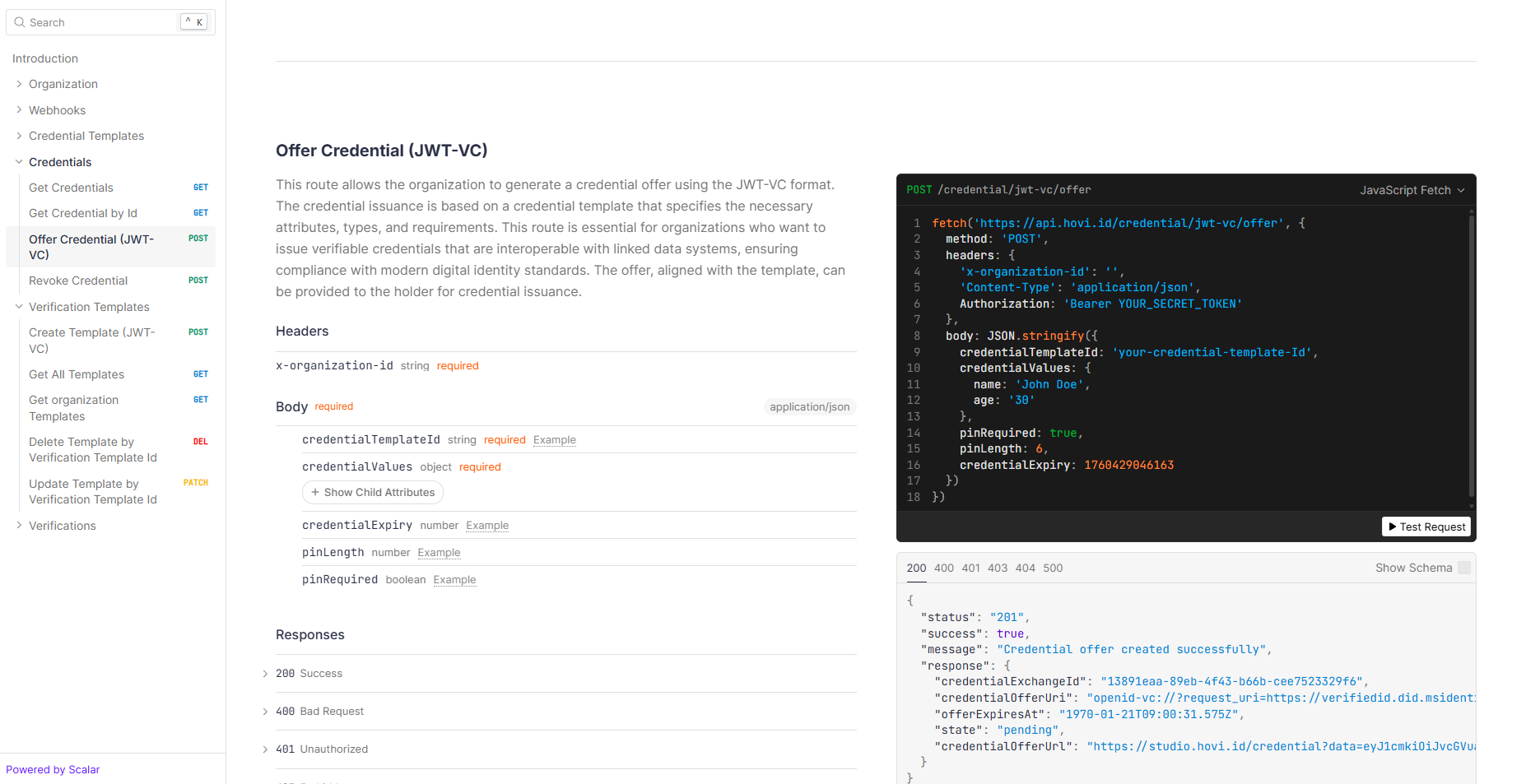 - Navigate to the POST - Offer Credential (JWT-VC) endpoint and click “Test Request”.