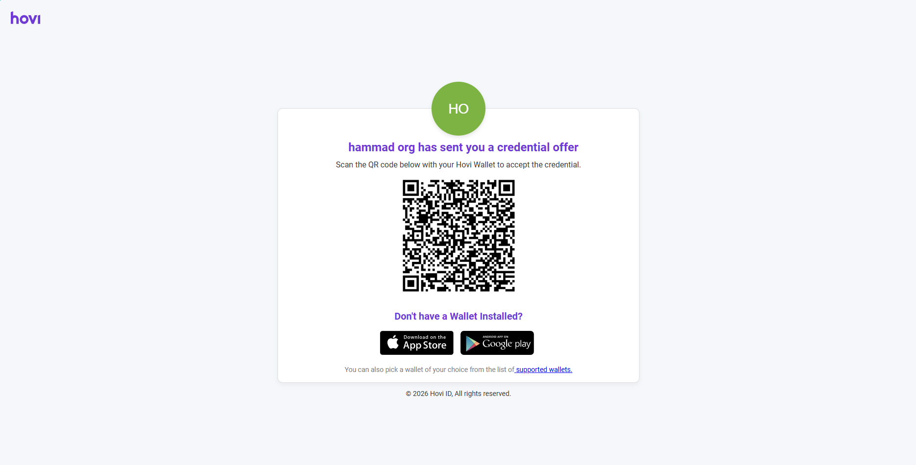 credentialOfferIUrlleads to a QR code that the holder can scan using the Hovi Wallet or any supported third-party wallet (refer to Hovi Supported Wallets) to receive the credentials offer request in their wallet.