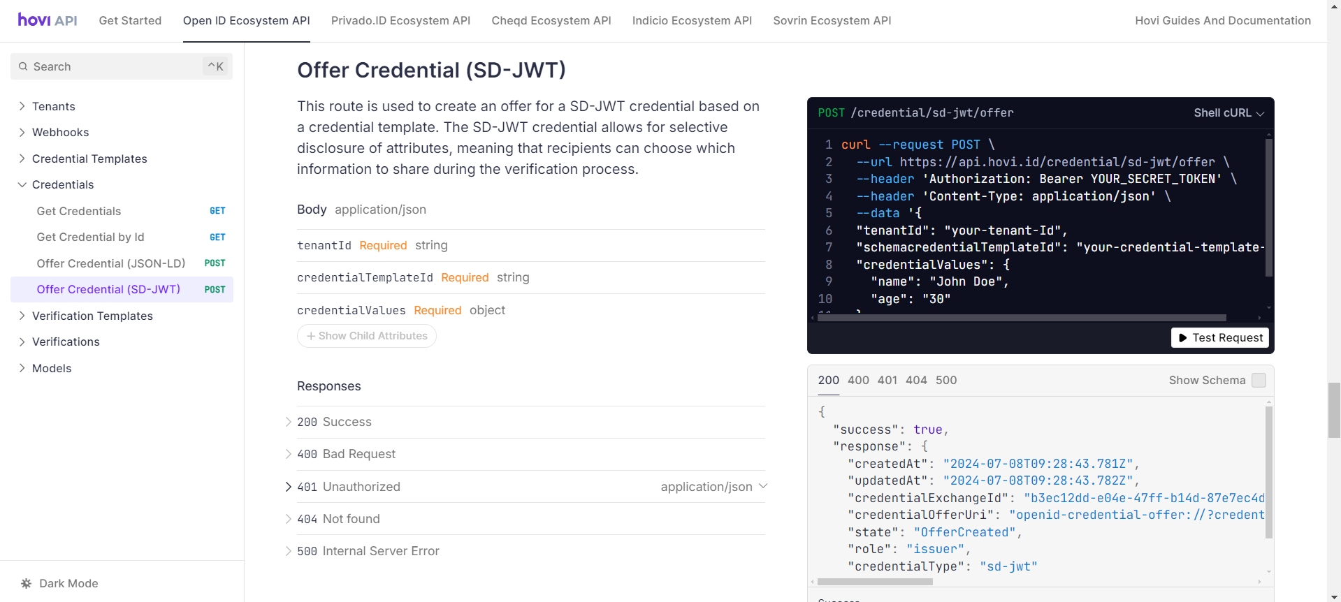 - To issue a credential navigate to POST - Offer Credential (SD-JWT) endpoint and click “Test Request”.