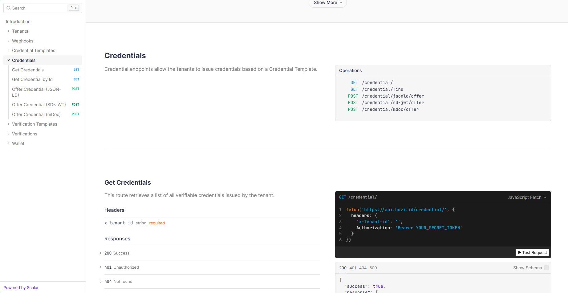 Hovi's Credentials endpoints enable tenants to issue verifiable credentials based on predefined Credential Templates. These endpoints can be used to retrieve and issue credentials that recipients or holders can store securely in digital wallets, such as the Hovi Wallet or any other supported wallet (refer to Hovi Supported Wallets). Once stored, the credentials can be shared with verifiers when needed.