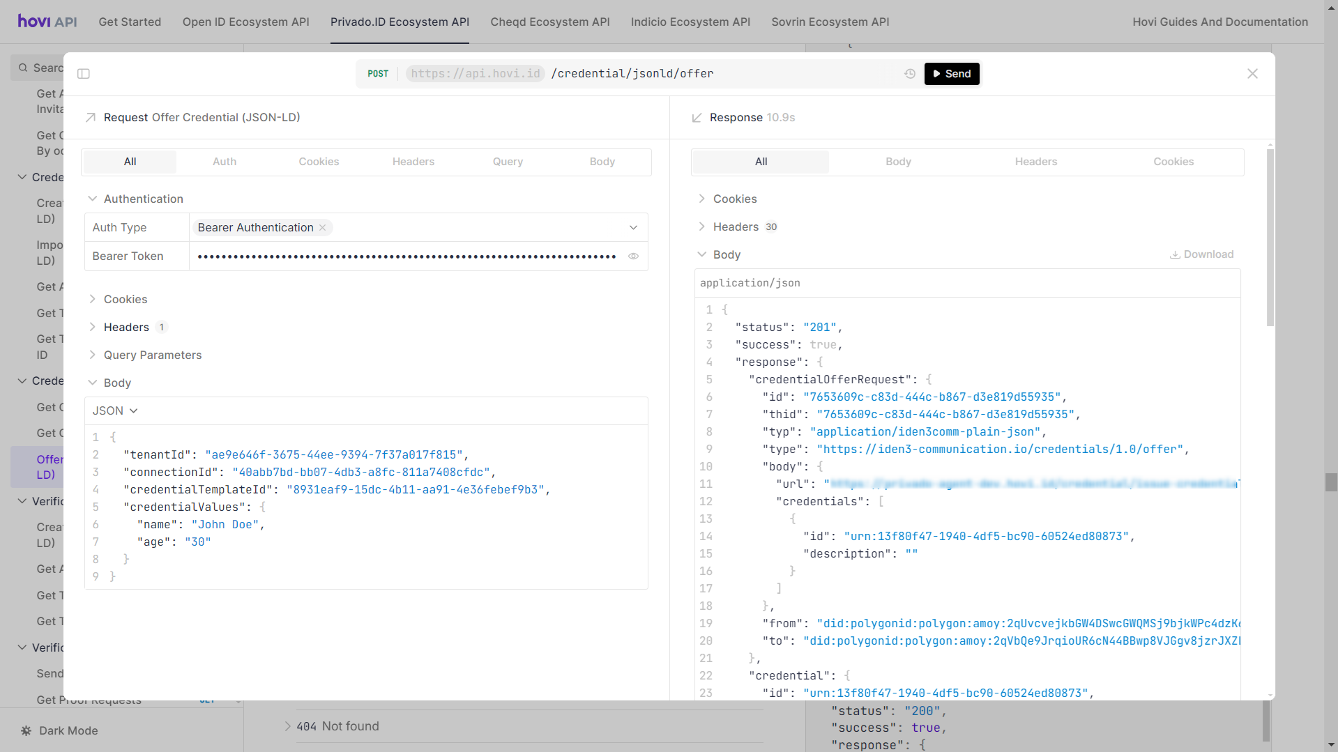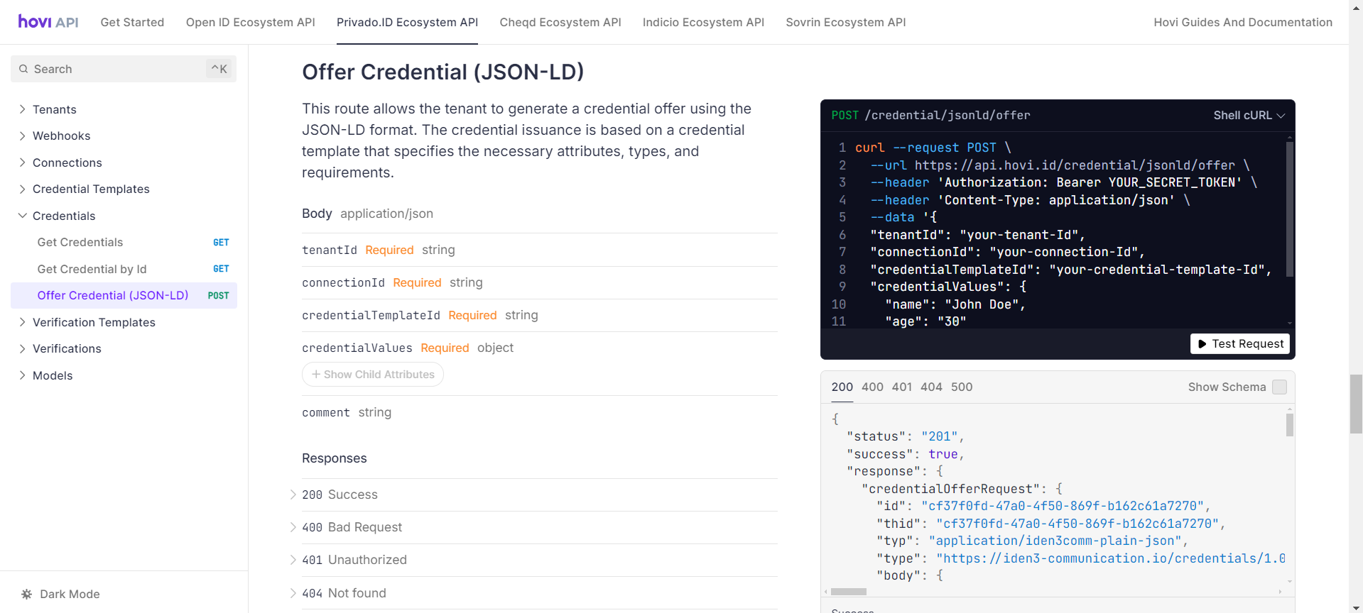 - Navigate to the POST - Offer Credential (JSON-LD) endpoint and click “Test Request”.