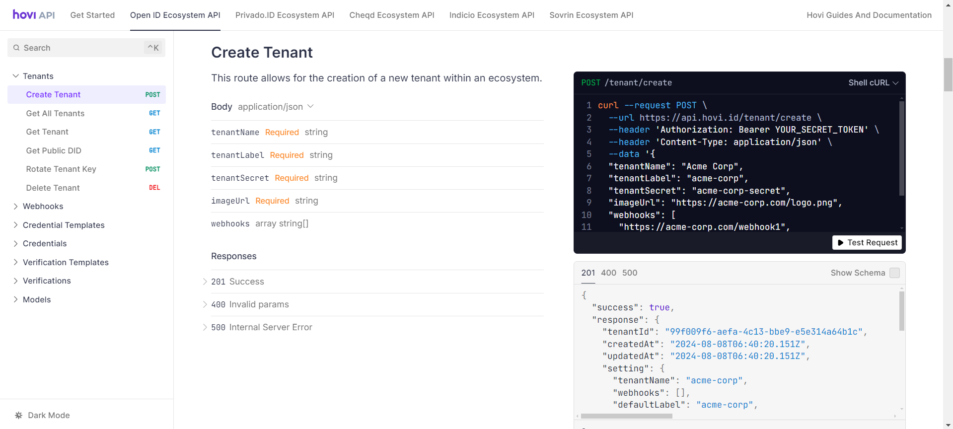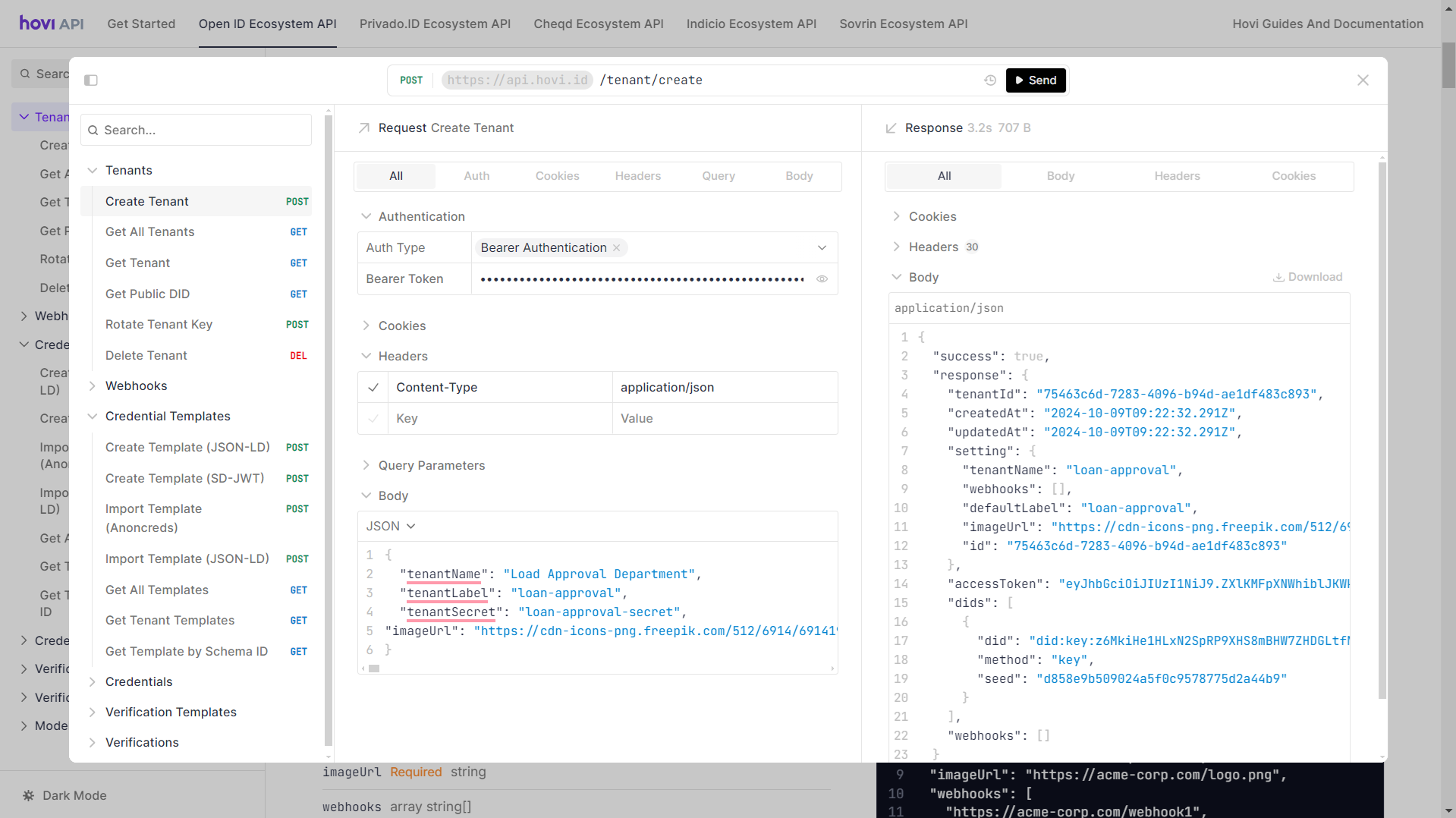 Hovi’s Organization endpoints enable you to create, update, delete, and retrieve tenants. Additionally, you can rotate a tenant's secret key and access public DIDs. For more information, please visit here.