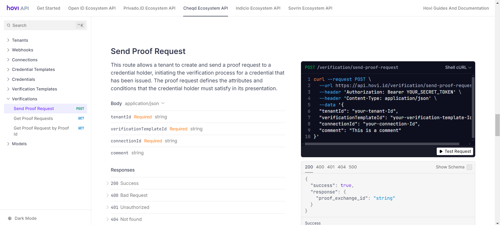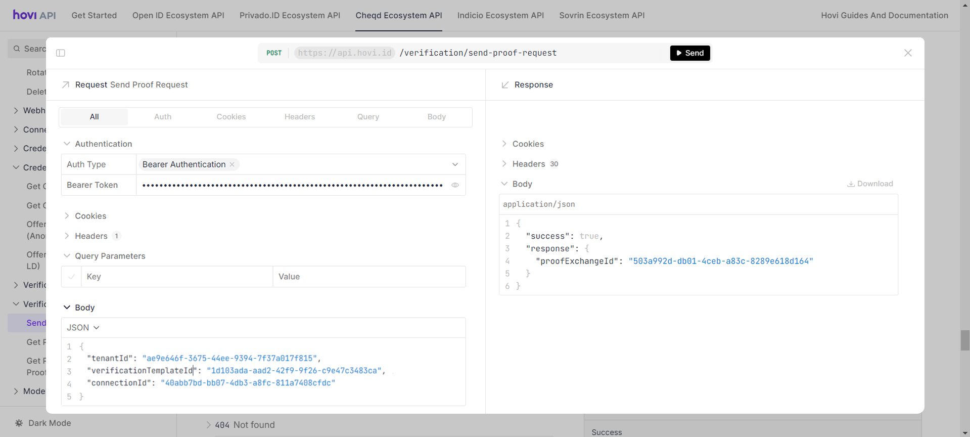 Hovi’s Cheqd Verifications endpoints enable you to send proof request and get proof request by tenant ID or proof exchange ID. For more information, please visit Hovi API Reference.