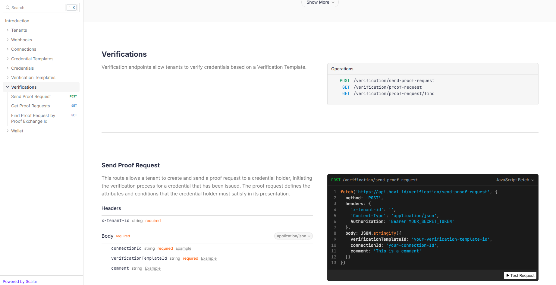 Hovi's Verifications endpoints allow tenants to verify credentials held by recipients or holders. These endpoints can be used to retrieve or create proof requests. Verifiers (such as organizations or institutions) can use these endpoints to confirm the authenticity and validity of a credential without directly accessing the holder's private information.