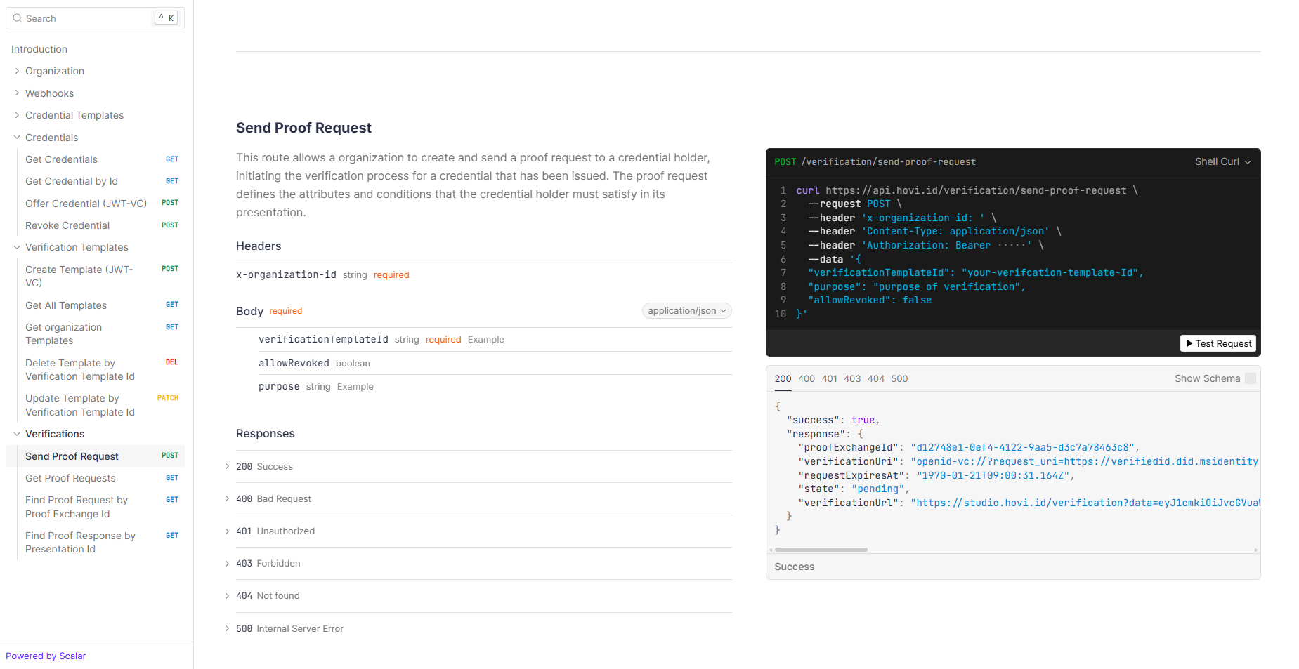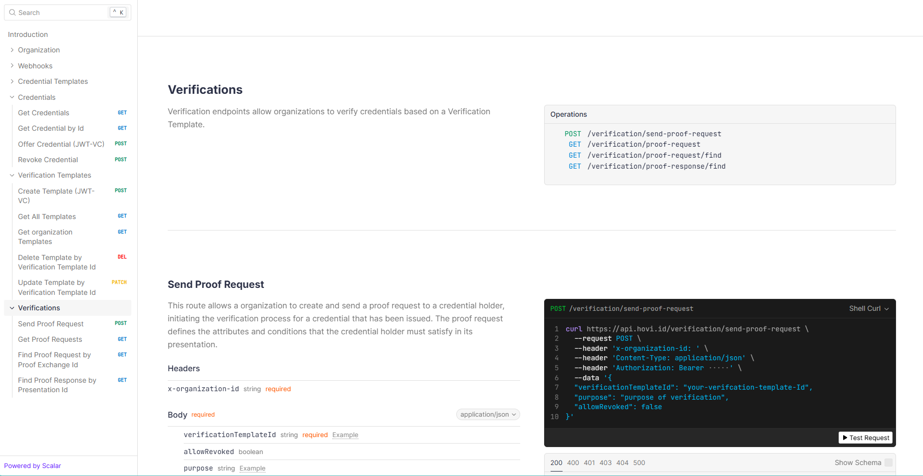 Hovi's Verifications endpoints allow tenants to verify credentials held by recipients or holders. These endpoints can be used to retrieve or create proof requests. Verifiers (such as organizations or institutions) can use these endpoints to confirm the authenticity and validity of a credential without directly accessing the holder's private information.