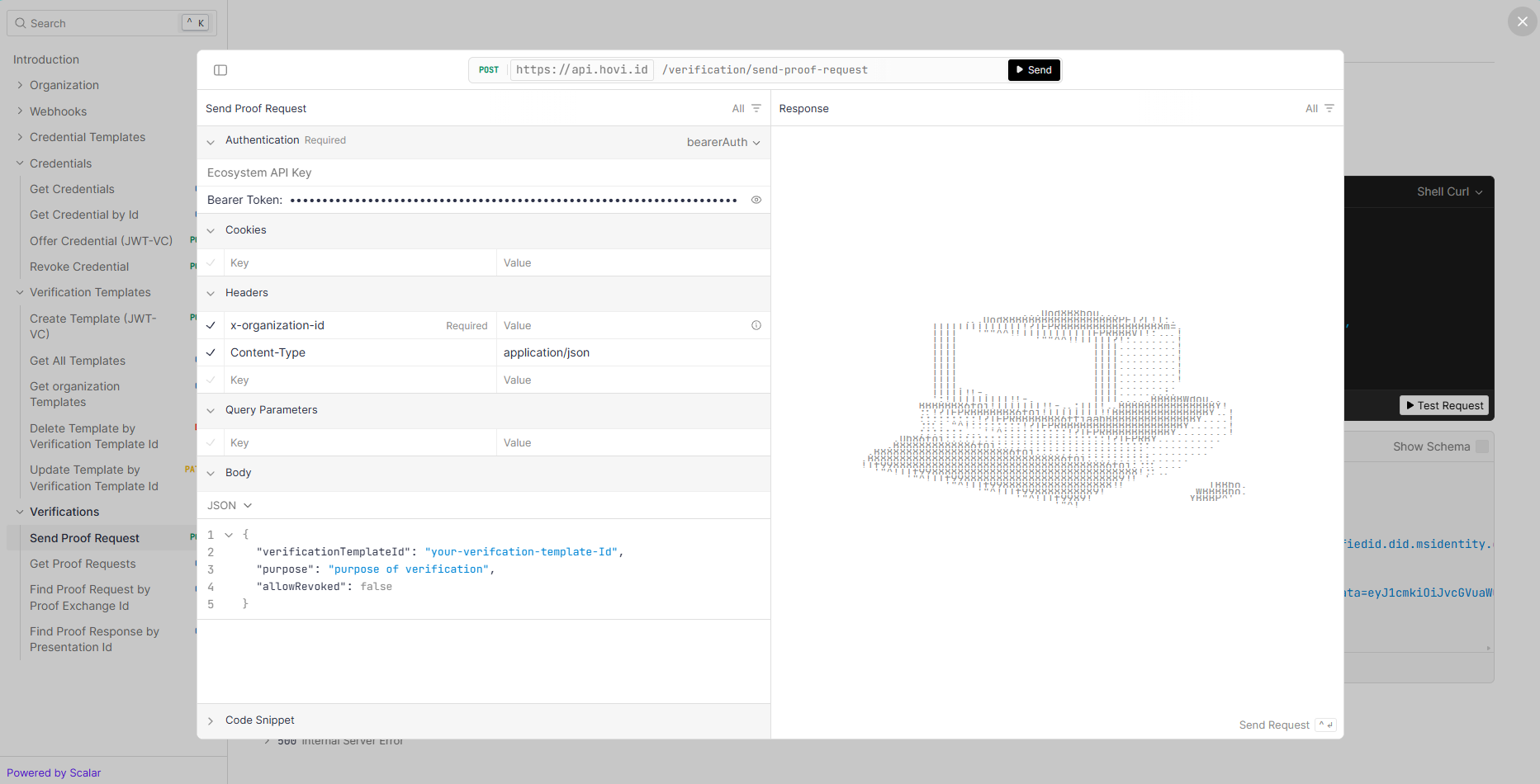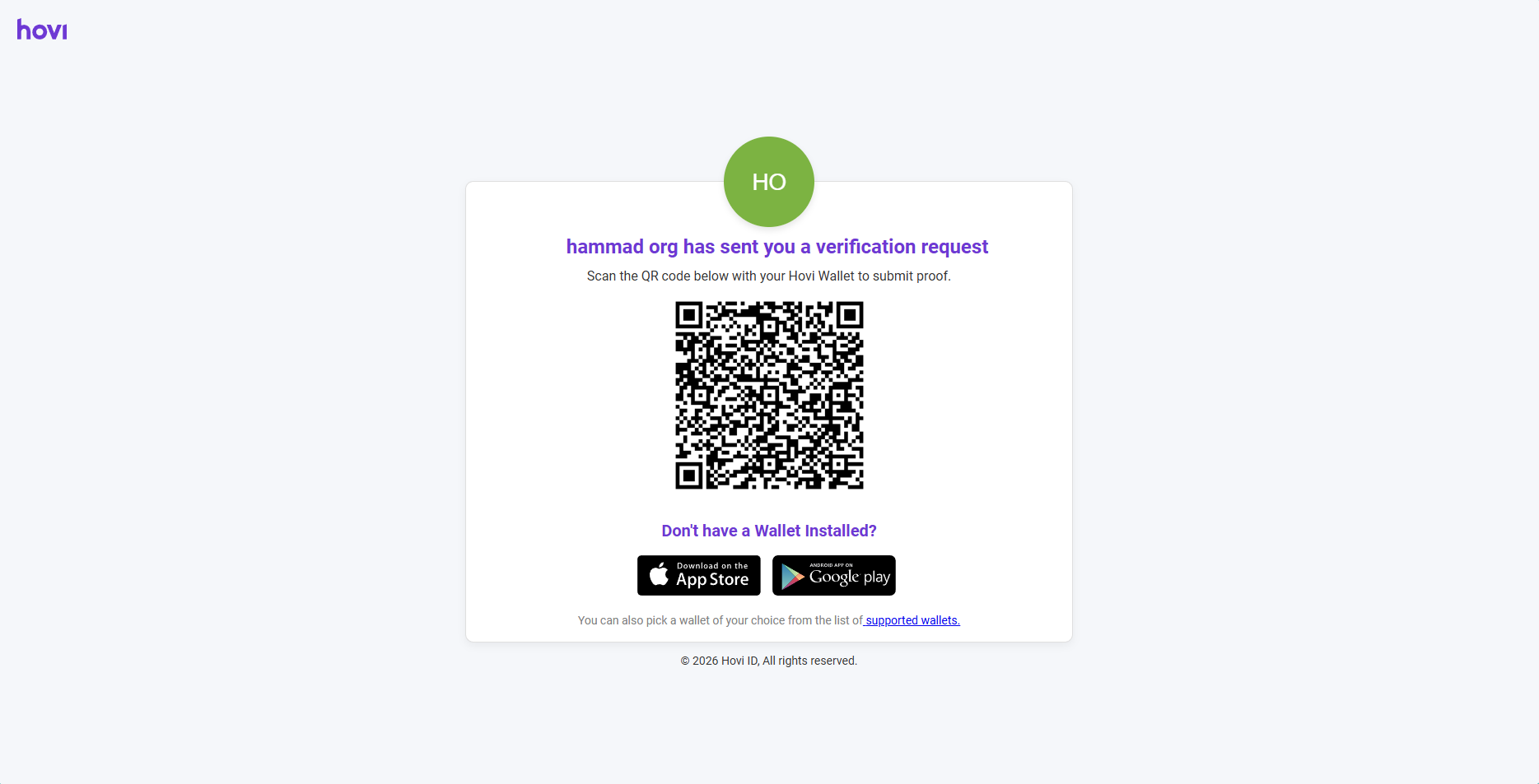 verificationUrlleads to a QR code that the holder can scan using the Hovi Wallet or any supported third-party wallet (refer to Hovi Supported Wallets) in order to receive the credentials verification request in their wallet.