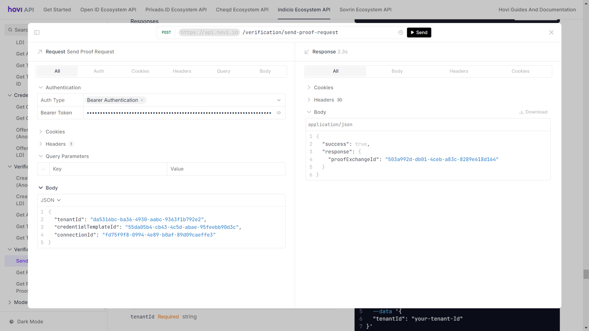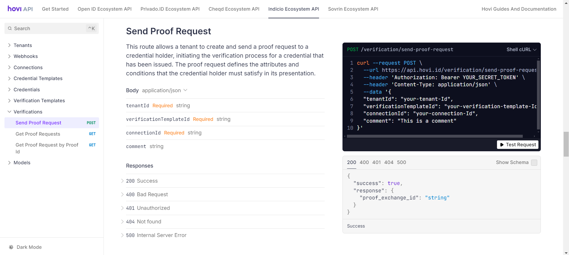 Hovi’s Indicio Verifications endpoints enable you to send proof request and get proof request by tenant ID or proof exchange ID. For more information, please visit Hovi API Reference.