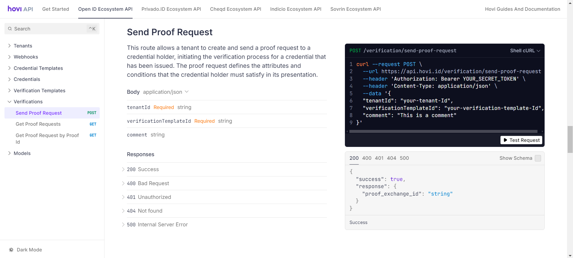 Hovi’s OpenID Verifications endpoints enable you to send proof request and get proof request by tenant ID or proof exchange ID. For more information, please visit Hovi API Reference.
