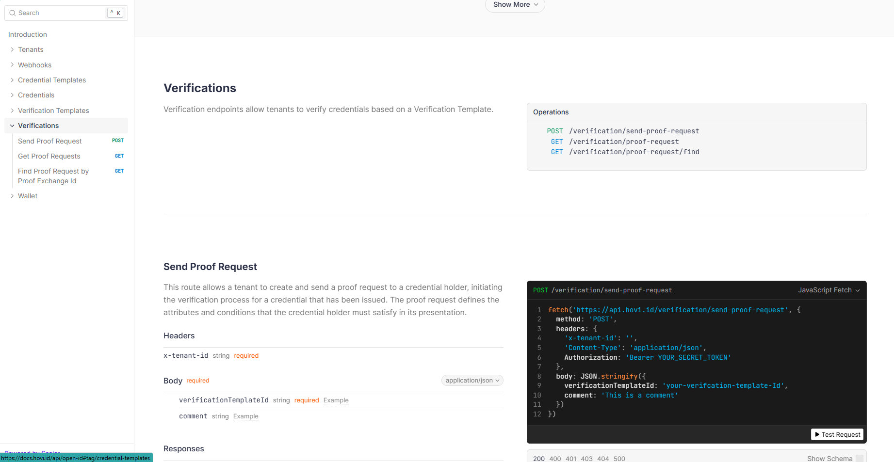 Hovi's Verifications endpoints allow tenants to verify credentials held by recipients or holders. These endpoints can be used to retrieve or create proof requests. Verifiers (such as organizations or institutions) can use these endpoints to confirm the authenticity and validity of a credential without directly accessing the holder's private information.