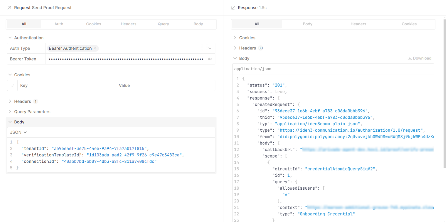 Hovi’s Polygon Verifications endpoints enable you to send proof request, get proof request by tenant ID or proof exchange ID and get proof responses by tenant ID or presentation ID. For more information, please visit Hovi API Reference.