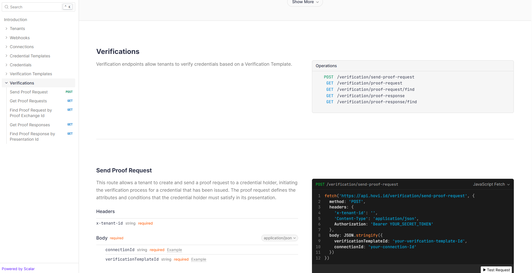 Hovi's Verifications endpoints allow tenants to verify credentials held by recipients or holders. These endpoints can be used to retrieve or create proof requests. Verifiers (such as organizations or institutions) can use these endpoints to confirm the authenticity and validity of a credential without directly accessing the holder's private information.