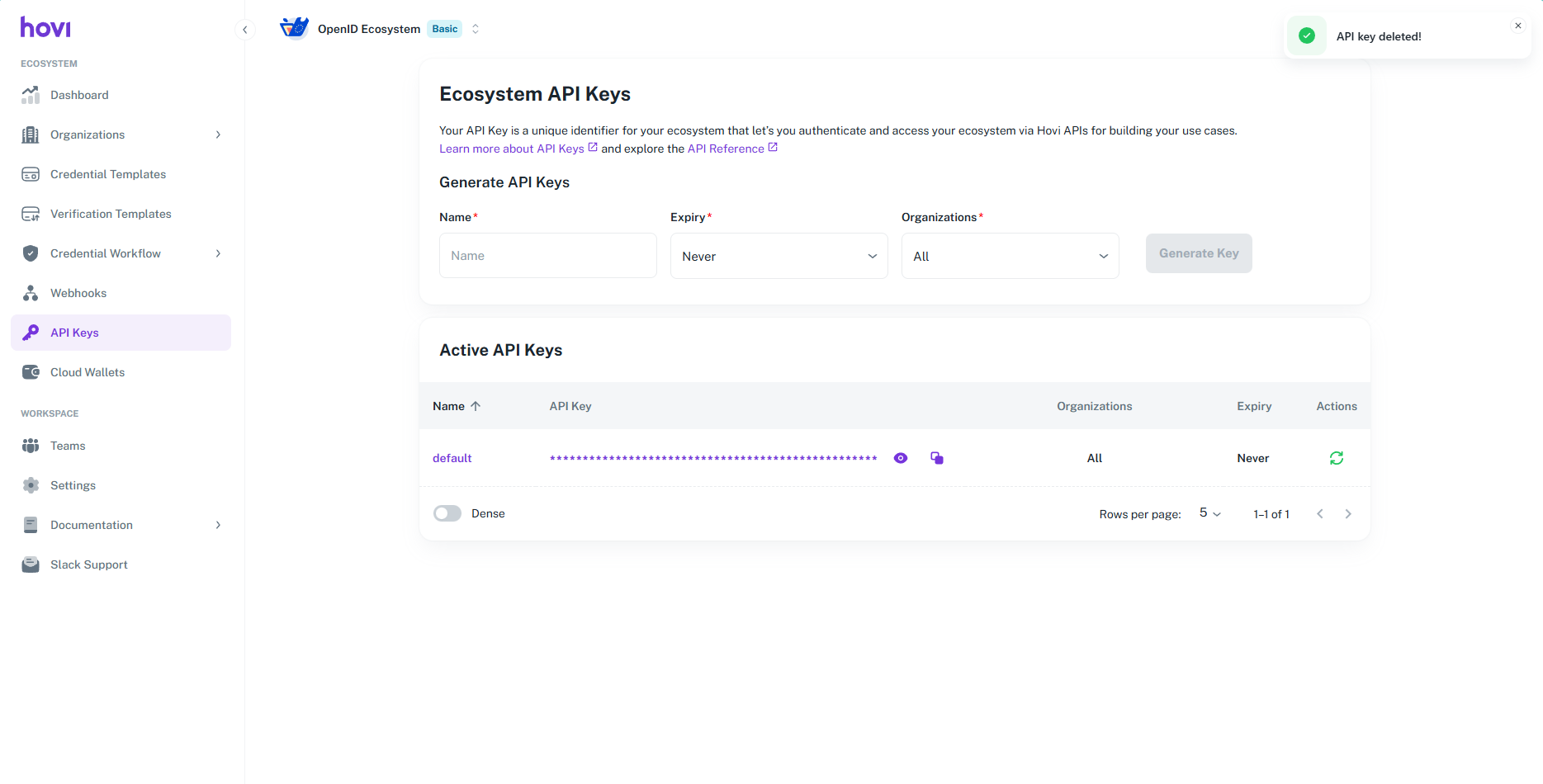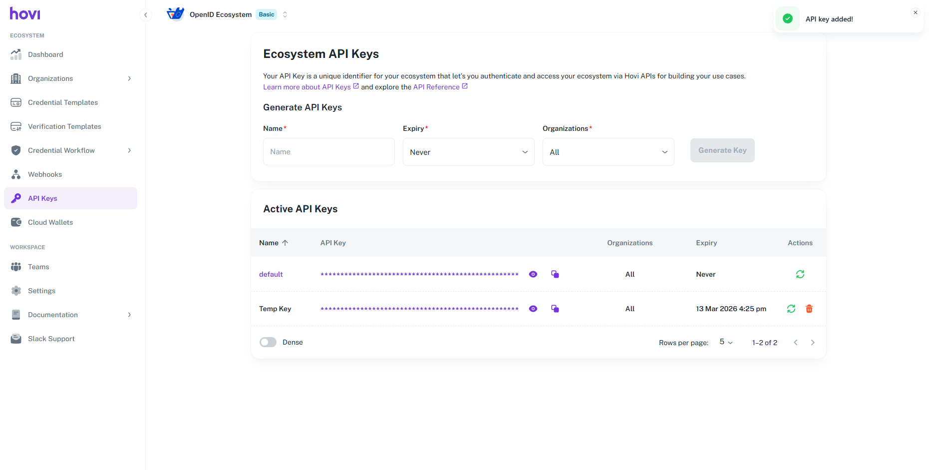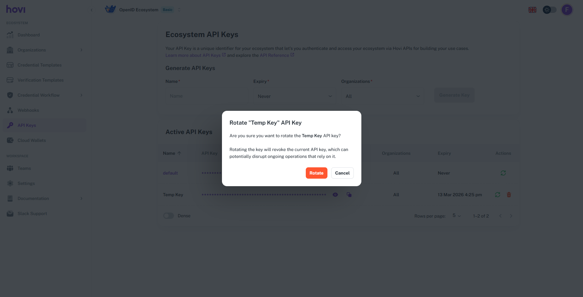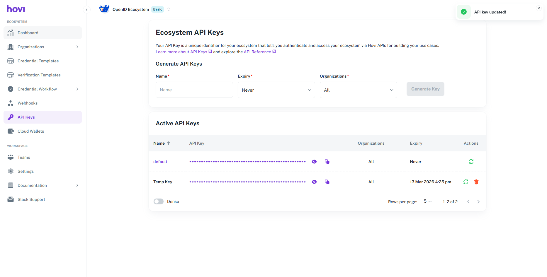 API keys are essential for authenticating and securing your interactions with Hovi APIs. In Hovi Studio, you can create, control, and manage your API keys to ensure security and proper access to your ecosystem. This guide outlines how to view, copy, create, rotate, delete, and set expiration for your API keys.