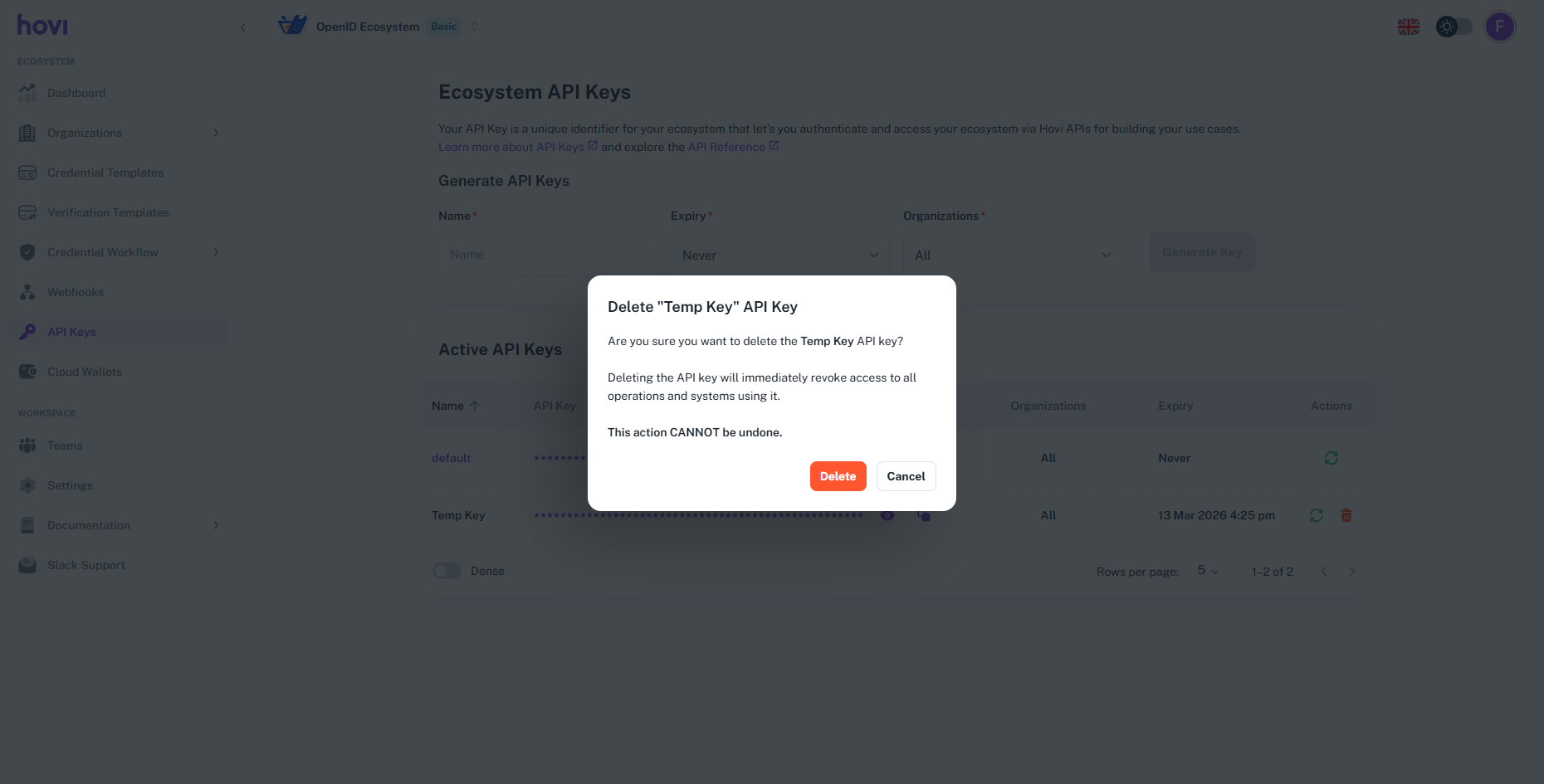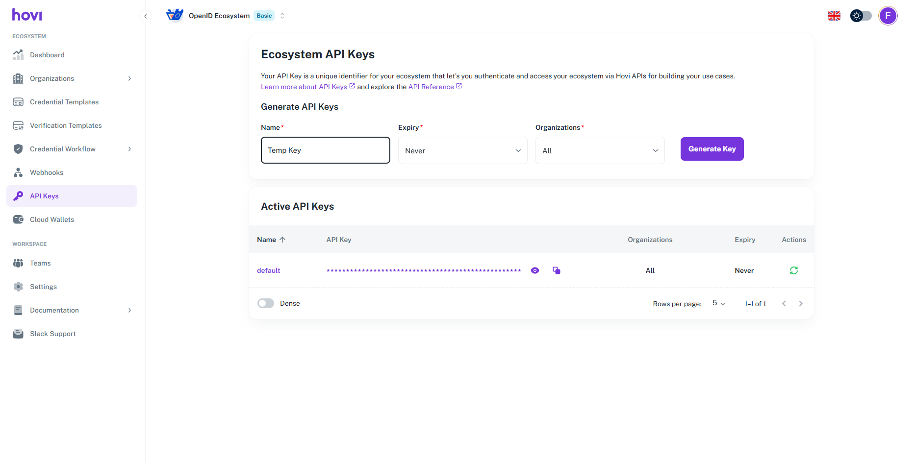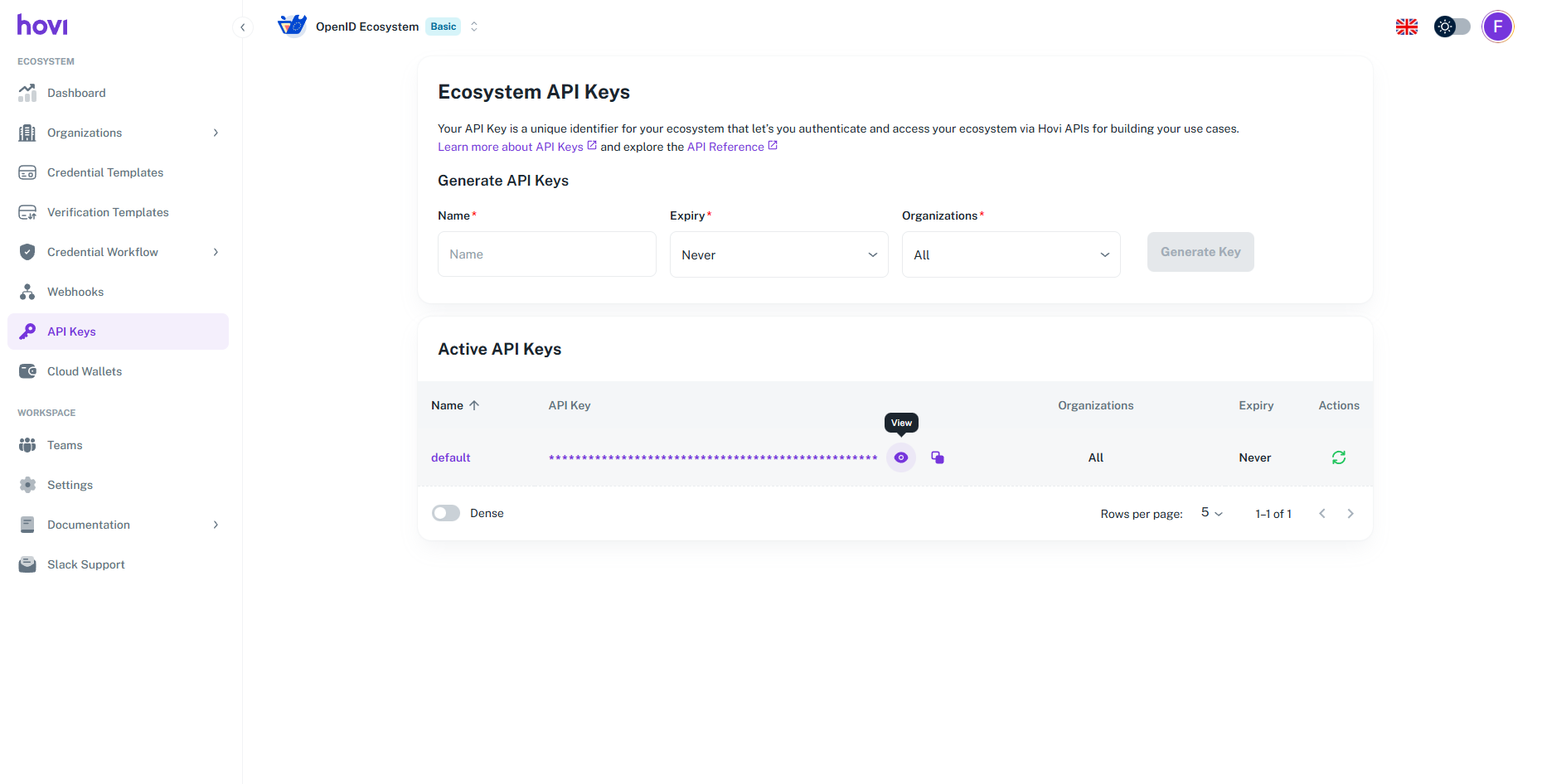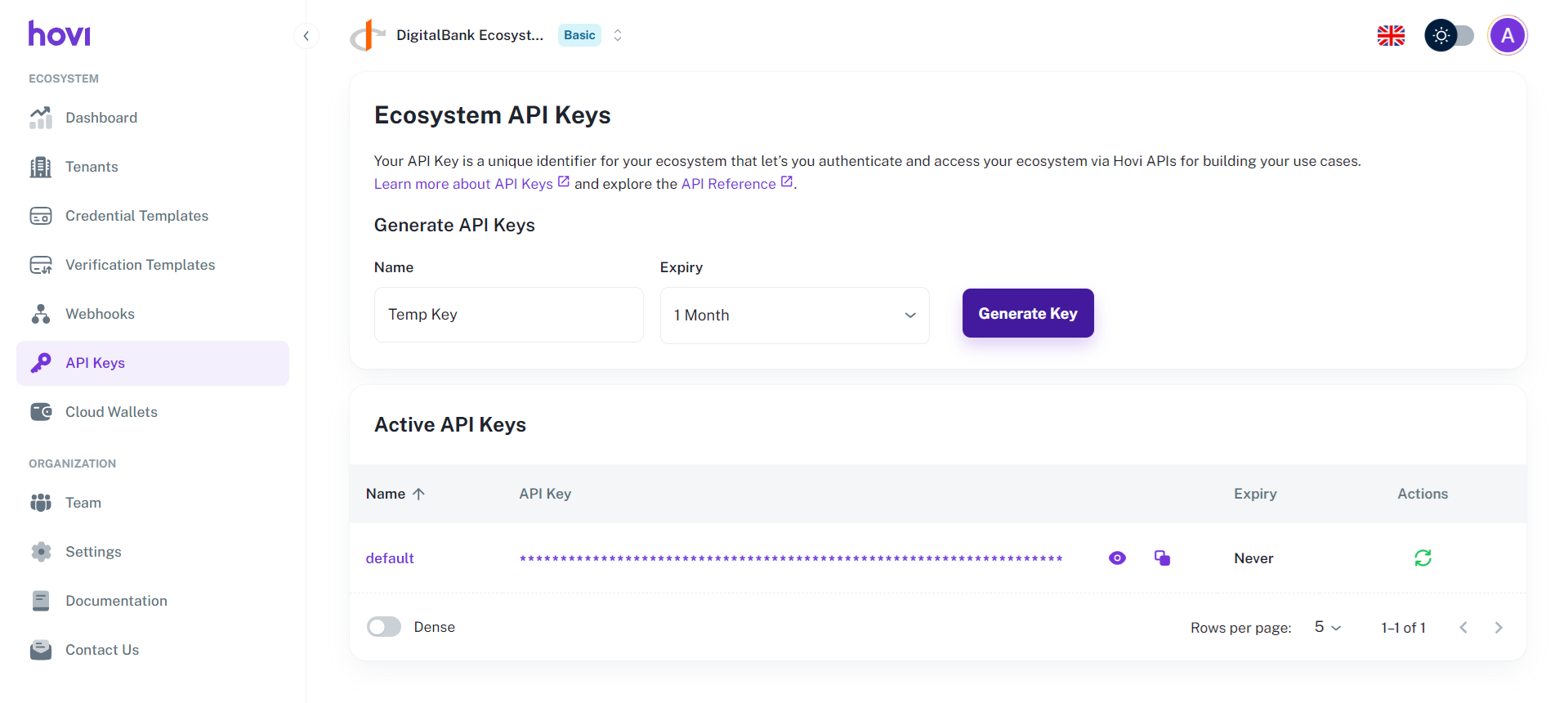 API keys are essential for authenticating and securing your interactions with Hovi APIs. In Hovi Studio, you can create, control, and manage your API keys to ensure security and proper access to your ecosystem. This guide outlines how to view, copy, create, rotate, delete, and set expiration for your API keys.