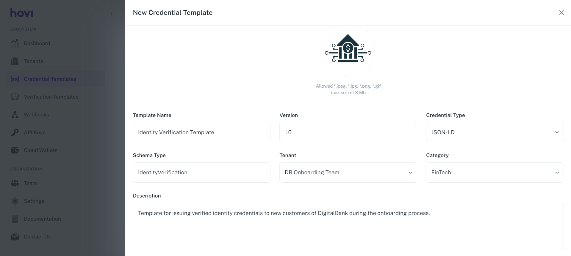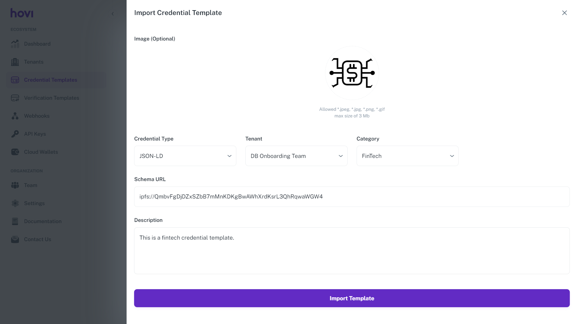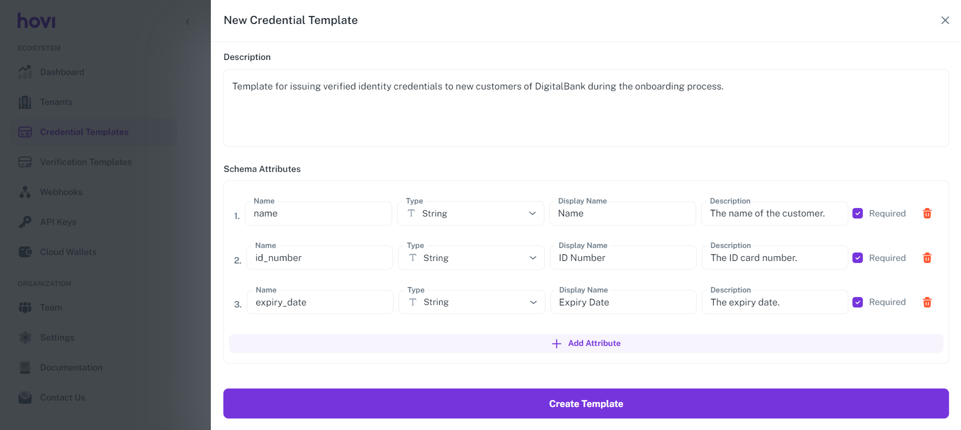 In Hovi Studio, a credential template defines the structure, data fields, and format for creating credentials. By using credential templates, you can standardize the credential issuance process across your ecosystem, ensuring consistency and uniformity in the credentials issued. Templates can be assigned to any tenant and can be reused within the ecosystem.