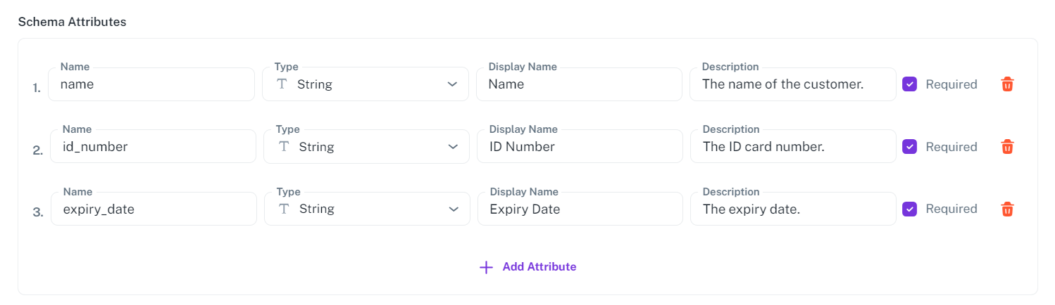 Schema Attributes: List the data fields required for the credential (e.g., Name, Date of Birth, Issuer, etc.).