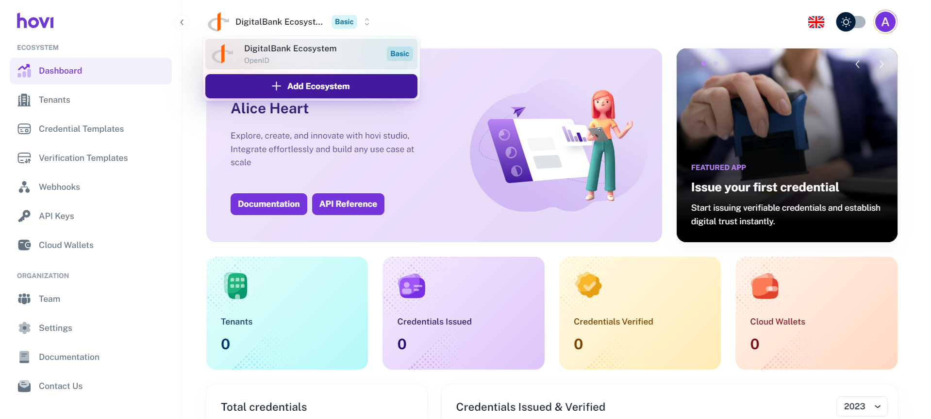 An Ecosystem in Hovi Studio refers to a self sovereign identity network where various tenants (organizations or entities) can securely interact, issue, and verify digital credentials.