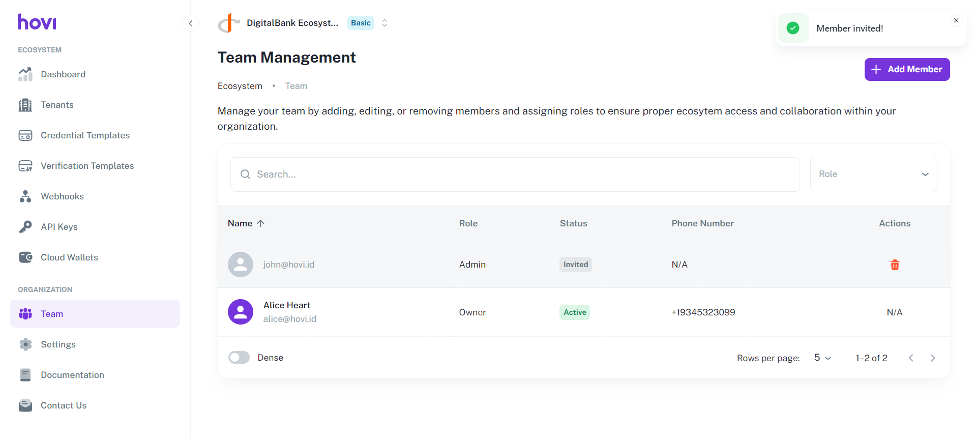 Manage your team within Hovi Studio by adding, editing, or removing members and assigning roles to ensure proper ecosystem access and collaboration within your organization. This ensures that the right members have appropriate access.