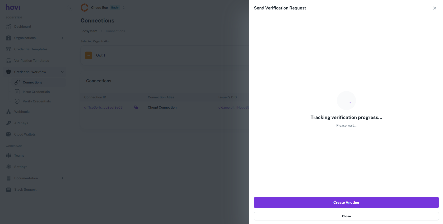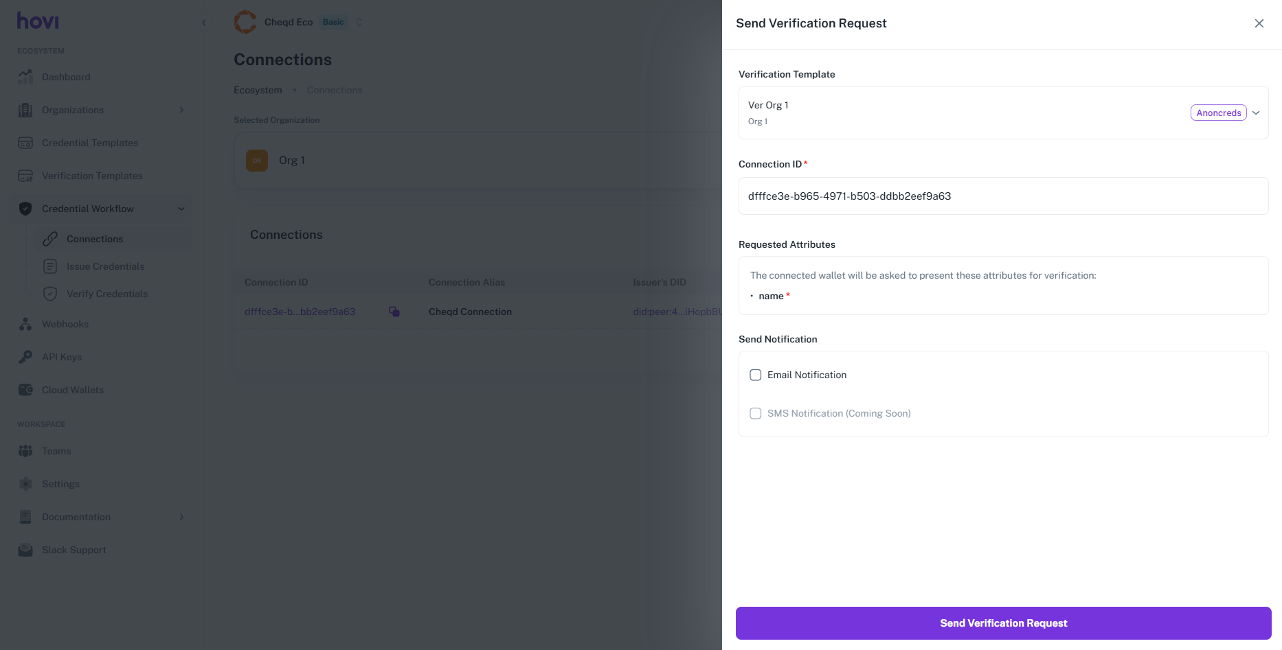 Hovi Studio provides an intuitive interface for verify credentials to recipients through established connections. The Verify Credentials module allows tenants to seamlessly verify credentials based on predefined verification templates.