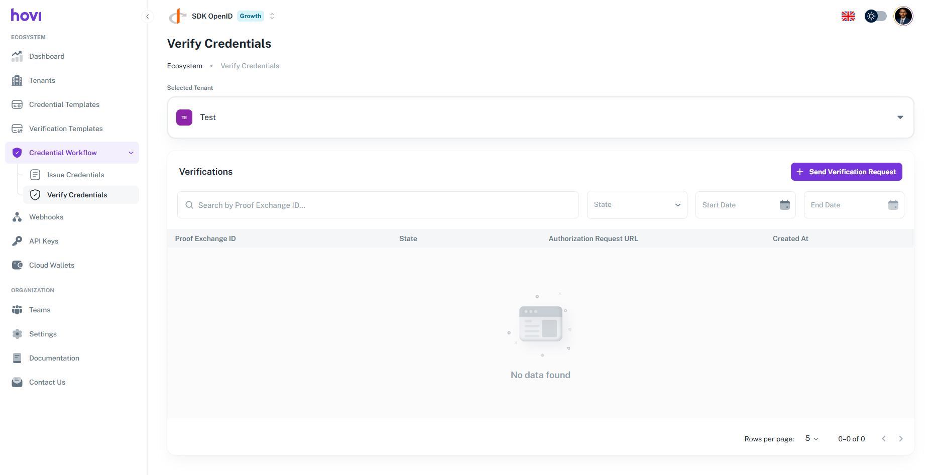 Hovi Studio provides an intuitive interface for verify credentials to recipients. The Verify Credentials module allows tenants to seamlessly verify credentials based on predefined verification templates.