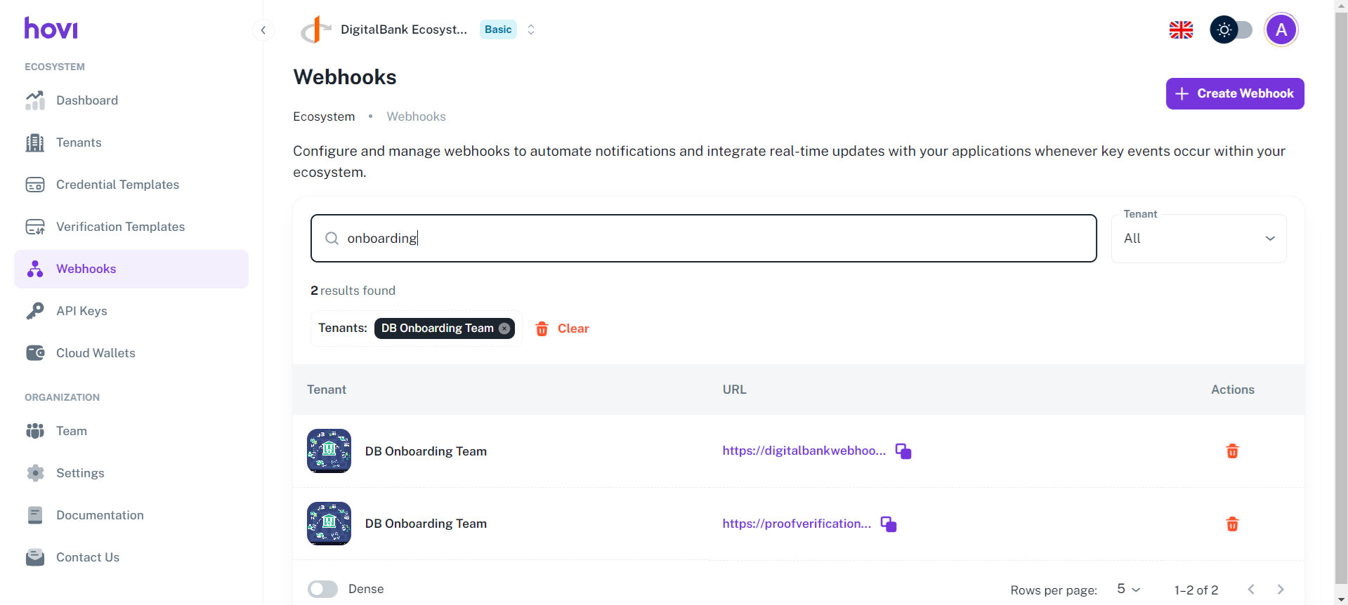 Search and Filter Webhooks: You can search and filter a webhook by its organization name or keyword.