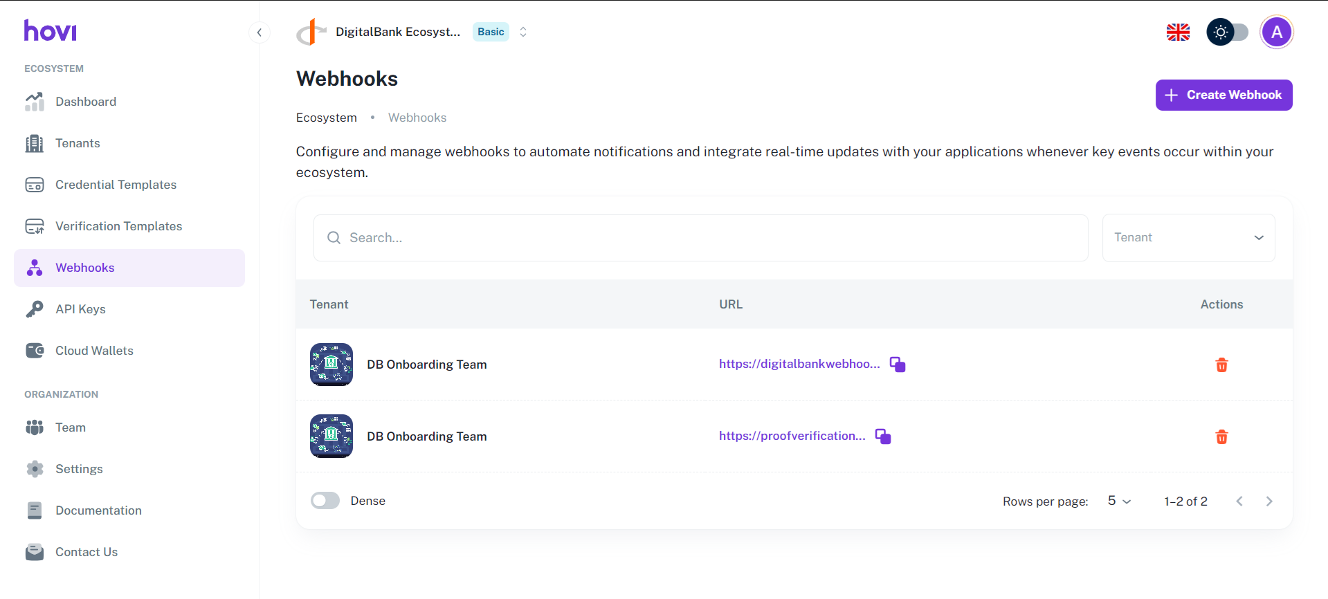 View Webhooks: The Webhooks tab will display a list of existing webhook URLs along with the corresponding organization names. Here, you can view and manage your webhooks.