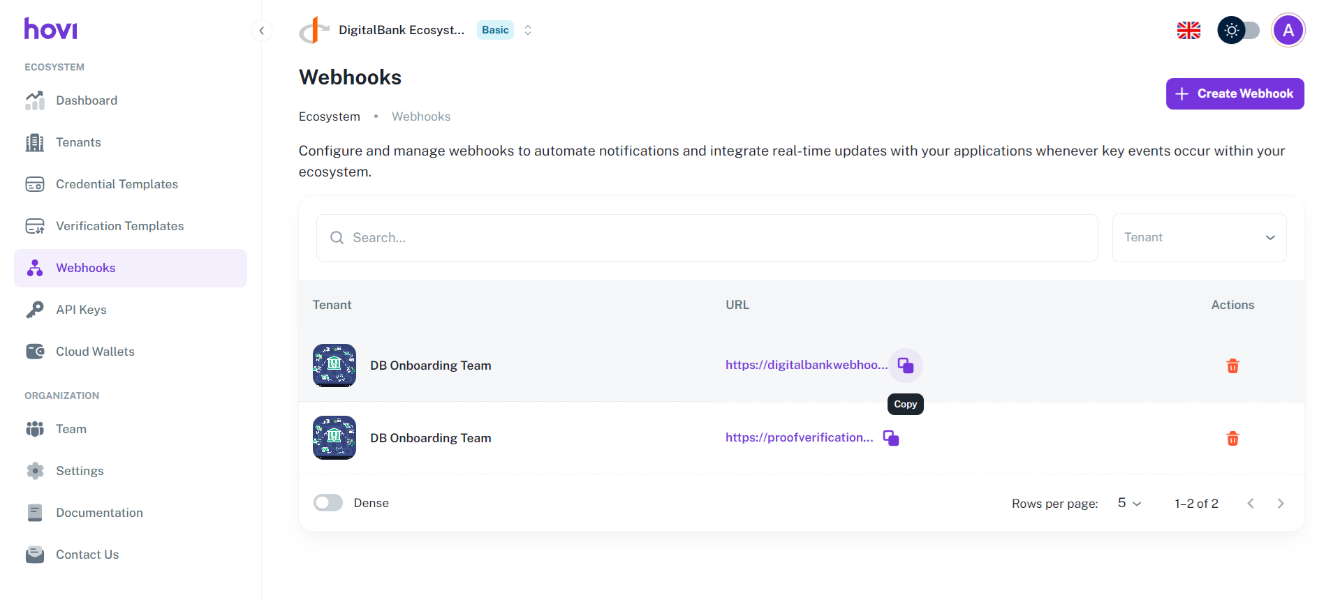You can view, copy the URL, or delete existing webhooks from the Webhooks tab.
